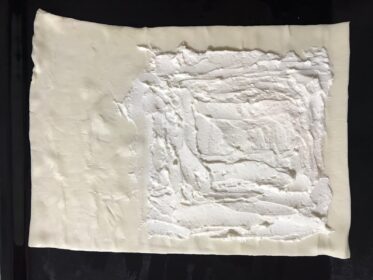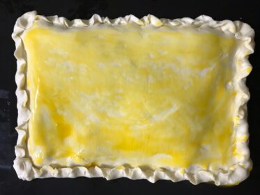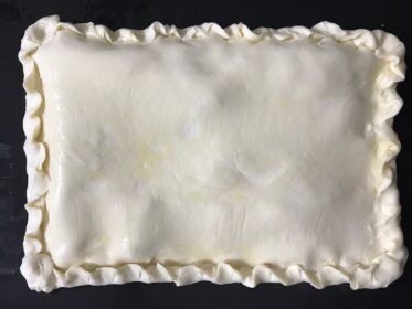 - For this pastry, I use puff pastry. Place the dough rectangle on a baking sheet greased with oil. Finely chop the garlic, add it to the ricotta and salt.Spread only half of the dough.